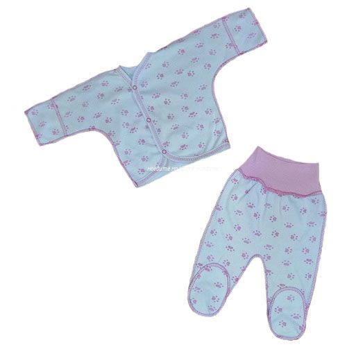 Комплект состоит из распашонки с рукавчиками-трансформерами, с асимметричной застёжкой спереди на кнопочках и ползунков на широкой резинке.